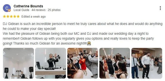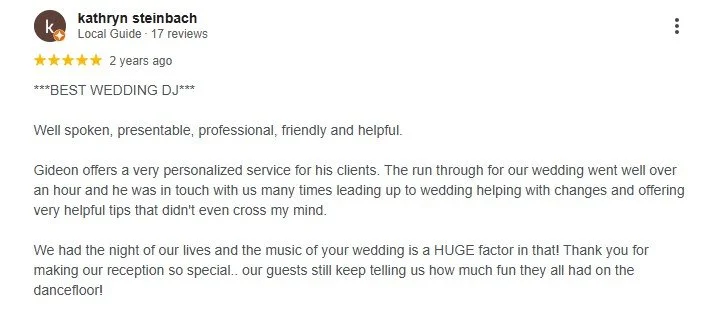 " Thank you so much for your amazing service ! You made our wedding a massive success. Everything ran smoothly and our guests could not stop talking about how wonderful your selection of music was. Truly an amazing night had by all! Highly recommended. Thank you so much. "